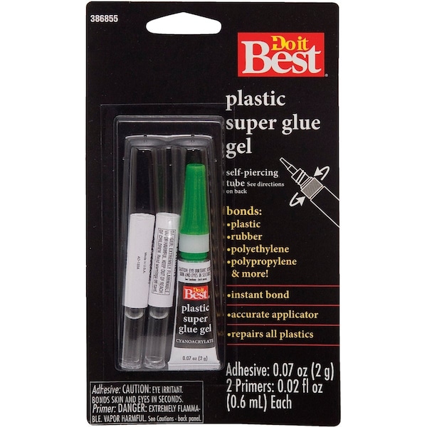 2 part system primer and super glue gel. Instant bond sets in 10 to 30 seconds. Bonds plastics rubber polyethylene polypropylene and more. Self-piercing tube. Includes (1) 2 gram adhesive tube and (2) 2.02 Oz. primers.