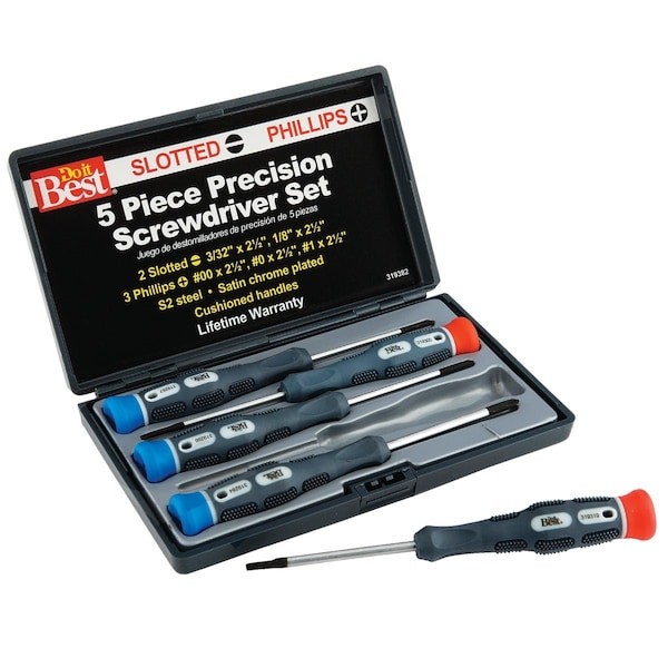 For computer hobbyists watchmakers optical and all other detailed work. Large swivel head for greater control. Color-coded and cushion-grip handles. 2-1/2 chrome vanadium steel blade with black tip ensures long life. Molded storage case. Set includes 1 each: Slotted 3/32 and 1/8 Phillips No. 00 No. 0 and No. 1.