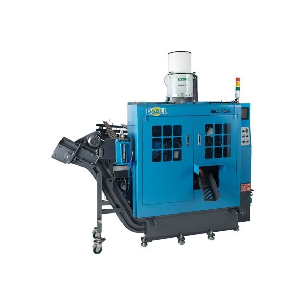 sc-75a the doall sc-75a circular saw offers automatic operation, numerical control and features solid heavy-duty construction which provides more rigidity and reduces vibration for higher cutting rates, exceptional accuracy, superior surface finish and increased blade life. This automatic cut off, cold saw is designed for cutting a wide range of metals on a high production basis. standard equipment: plc control for all electric and hydraulic functions easy conversational hmi infinitely variable blade speed controlled by inverter hydraulic front & vertical vises floating shuttle device hydraulic sorting chute electro-magnetic power brake automatic chip conveyor powered band brush air blow device for tube cutting automatic loading table for round bar cutting mist oil - 5 gallons work light set up tools and tool box instruction and parts manuals on cd or usb data stick specifications: cutting capacity round: 0.3? - 3? (8 - 75mm) cutting capacity rectangle: 0.3-2.36? x 0.3-2.36? (8 - 60 x 8 - 60mm) blade motor: 15 hp (11.1 kw) hydraulic pump motor: 2 hp (1.47 kw) blade speed: 30 - 150 rpm (9-45 mpm) blade size: 11.2? (285mm) blade width: 0.079? x 0.069? (2x1.75mm) blade and bar feed system: servo motor and ball screw automatic feed length single: 0.24? to 24? (6-600mm) automatic feed length multiple: 2.4? to 236? (60-6000mm) remnant length drop: 2.4" (60mm) cooling: air compressed oil mist machine weight with table: 6173 lbs. (2800 kg) floor space required (w x l): 110 x 270? (2780x6850mm)