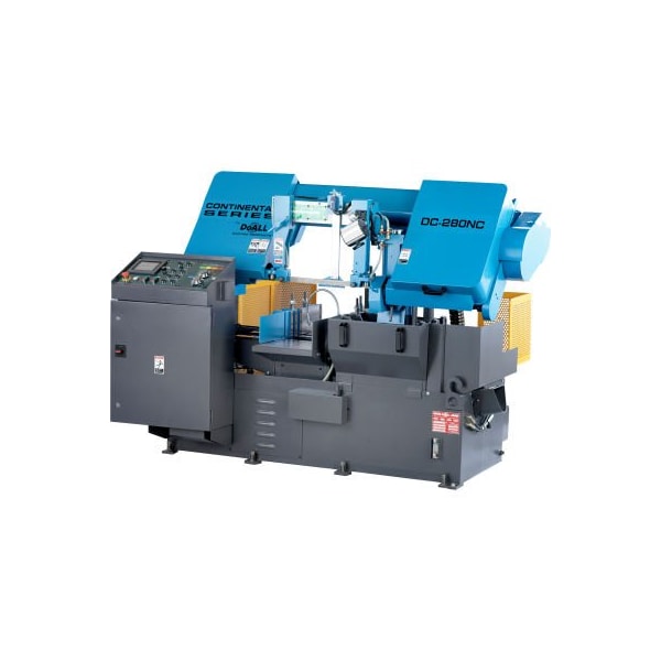 dc-280nc the dc-280nc continental series high production, horizontal band saws by doall are designed for cutting a wide range of metals on a production basis. They offer automatic operation, numerical control and feature solid heavy-duty construction. This provides more rigidity and reduces vibration for higher cutting rates, exceptional accuracy, superior surface finish and increased blade life. standard equipment: plc control for all electric and hydraulic functions infinitely variable speed controlled by vfd hydraulic retractable shuttle vise material indexer rapid and creep speed index vise control multi-step full stroke vises with split front vise and variable vise pressure control nesting fixture for bundle cutting spring loaded, zero clearance, coolant through, carbide faced saw guide with lead-in rollers power driven, coolant flushed, blade cleaning wire brush flushing hose and auxiliary coolant nozzles hydraulic blade tension automatic chip conveyor blade breakage/stall motion detector shut off switch band door interlocks work light one 6.5 foot (2 meter) gravity conveyor tool kit complimentary doall cutting fluids package one doall bi-metal saw blade instruction and parts manuals on cd or usb data stick specifications: cutting capacity round: 11? (280mm) cutting capacity rectangle: 11-3/4? w x 11? h (300mm x 280mm) bundle capacity max.: 9-3/4? w x 4? h (250mm x 100mm) bundle capacity min.: 6-1/2? w x 5/8? h (165mm x 15mm) band saw blade: 1-1/4 x 0.042 x 151? (34x1.1x3820mm) band speed: 52-275 fpm (16-85mpm) band drive: 5 hp (3.7 kw) hydraulic pump: 1 hp (.75 kw) hydraulic tank capacity: 16 gal. (60 lit) coolant tank capacity: 21 gal. (80 lit) automatic index length single: 15.75? (400mm) automati