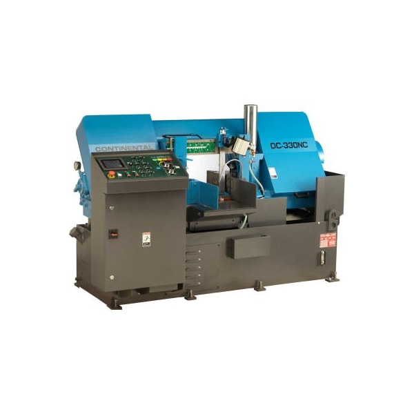 dc-330nc the dc-330nc continental series of high production, horizontal band saws by doall are designed for cutting a wide range of metals on a production basis. They offer automatic operation, numerical control and feature solid heavy-duty construction. This provides more rigidity and reduces vibration for higher cutting rates, exceptional accuracy, superior surface finish and increased blade life. standard equipment: plc control for all electric and hydraulic functions infinitely variable speed controlled by vfd hydraulic retractable shuttle vise material indexer rapid and creep speed index vise control multi-step full stroke vises with split front vise and variable vise pressure control nesting fixture for bundle cutting spring loaded, zero clearance, coolant through, carbide faced saw guide with lead-in rollers power driven, coolant flushed, blade cleaning wire brush flushing hose and auxiliary coolant nozzles hydraulic blade tension automatic chip conveyor blade breakage/stall motion detector shut off switch band door interlocks work light one 6.5 foot (2 meter) gravity conveyor tool kit complimentary doall cutting fluids package one doall bi-metal saw blade instruction and parts manuals on cd or usb data stick specifications: cutting capacity round: 13? (330mm) cutting capacity rectangle: 15-3/4 x 13? (400 x 330 mm) bundle capacity max.: 14-1/2 x 6-5/8? (370 x 170mm) bundle capacity min.: 6-1/2? x 2? (165 x 170mm) band saw blade: 1-1/4 x 0.042 x 167? (34 x 1.1 x 4242mm) blade speed: 52-275 fpm (16-85mpm) band drive: 5 hp (3.75 kw) hydraulic pump: 1 hp (.75 kw) hydraulic tank capacity: 16 gal. (60 lit) coolant pump: 1/6 hp (0.12 kw) coolant tank capacity: 24 gal. (90 lit) automatic index length single: