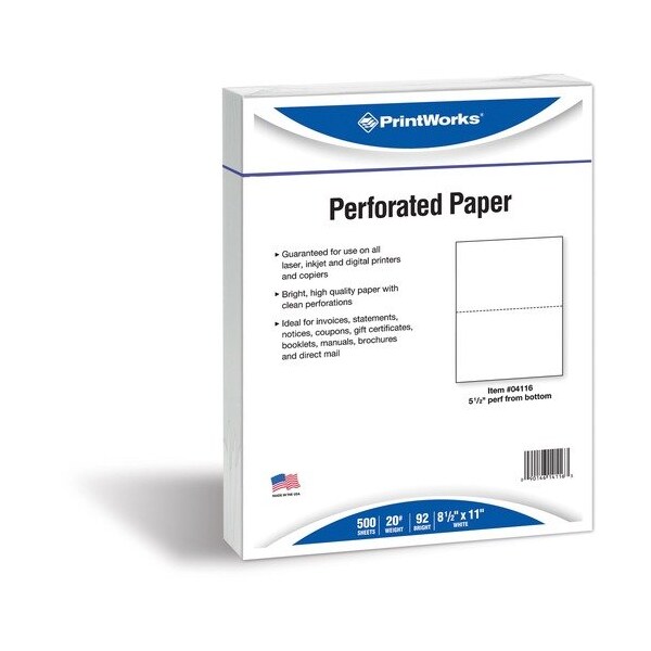 Office paper is compatible with laser printers, inkjet printers, digital printers and copiers. Bright, high-quality paper is perforated 5-1/2'' from the bottom. Paper is perfect for creating invoices, statements, notices, coupons and more.