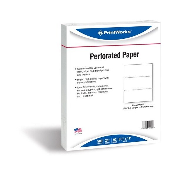 Office paper is compatible with laser printers, inkjet printers, digital printers and copiers. Bright, high-quality paper is perforated 3-2/3'' and 7-1/3'' from the bottom. Paper is perfect for creating invoices, statements, notices, coupons and more.