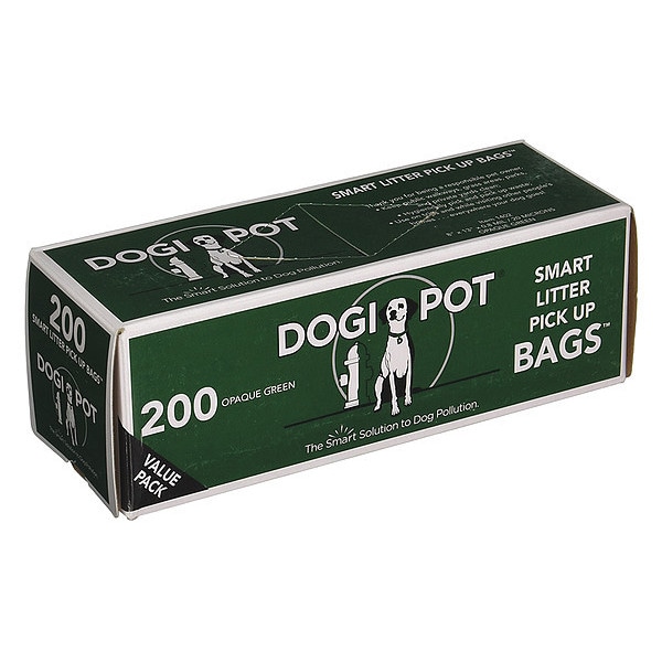 Pet Waste Bag, Capacity 8 oz, Trash Bag Material HDPE, Percent Recycled Content 0 Percent, Thickness 20 micron, Color Green, Bag Closure Type None, Width 8 in, Height 13 in, Max. Load 5 lb, Bottom Seal Type Flat, Scent Fragrance Free, Legend Dogipot(R) Logo, Package Configuration Coreless Roll, Bags per Roll 200, Rolls per Package 30, Item Pet Waste Bags, Application Dog Waste Pick Up, Package Quantity 30