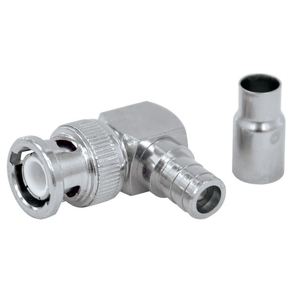 Coaxial Connector (Right Angle), Gender Male, Product Type Connector, Color Silver, Installation Method Crimp-On, Compatible Coaxial Cable Type RG-6, Maximum Frequency 4 GHz, Maximum Impedance 50 ohm, Connector Type BNC, Finish Nickel-Plated, Material Brass, Resistance Properties Corrosion Resistant, Standards RoHS Compliant, Package Quantity 10