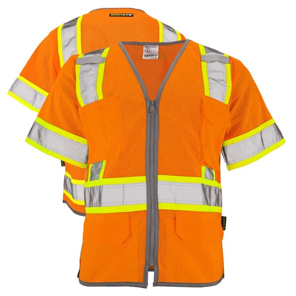 Stay safe and visible with the DOME75 DYNAMIC Series DV2533 Class 3 HiVis Viz-Cool Contrast Safety Vest. This industry-leading design ensures that professionals working day or night are seen. This piece of safety apparel designed with the highest safety and durability standards in mind is ANSI/ISEA 107-2020 Type R, Class 3 compliant, so you can feel confident that you are well-protected while on the job. Every detail has been completed precisely, from dual mic tabs to double-stitched Viz-Brite high-performance silver reflective tape for added visibility. It also features durable 3.5oz Viz-Cool mesh fabric, top stitched shoulder seams, and reinforced pockets including a left chest radio pocket with a flap and a right chest two-tier four-division pencil pocket. The lower right and left outside pockets with hook and loop flaps as well as the lower right and left inside patch pockets provide ample storage space. To top it off, the vest comes with bar tack reinforced zipper closure and 4-inch side splits for added maneuverability. Available in the strong high visibility color- HiVis Yellow, which is also imprint ready. Perfect for companies or individuals needing quality safety apparel with the option of in-house imprinting personalization. Invest today in the DOME75 DYNAMIC Series DV2533 Class 3 HiVis Viz-Cool Contrast Safety Vest.