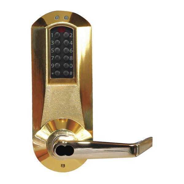 Electronic Keyless Lock, Function Storeroom, Access Method Keypad, Mounting Style Cylindrical, Lock Material Metal, Finish Bright Brass, Series 5000, Handle Type Lever, Door Thickness 1-3/4 in, Key Override Options Large Format Removable Cores; Small Format Interchangeable Core, Hand Nonhanded, Network Interface AL-DTM2, Outside Height 8 7/8 in, Outside Width 3 3/8 in, Outside Depth 3 13/16 in, Keypad Material Solid Metal, Power Source (4) AA Batteries, Battery Life Up to 180,000 Cycles