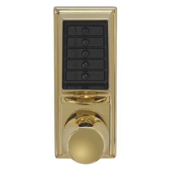 Mechanical Push Button Lockset, Handle Type Knob, Function Entry, Key Override Options None, Hand Nonhanded, Finish Bright Brass, Door Thickness 1-3/4 in, Keypad 5 Button, Vandal Resistant, Backset 2 3/4 in, Grade 1, ADA Compliant No, Yes Fire Rated, Case Material Steel, Series 1000, Latch Length 1/2 in, Max. User Codes 1, Standards ANSI 156.2 Grade 1, UL/ULC Listed, Weather Resistant Yes, Mechanical