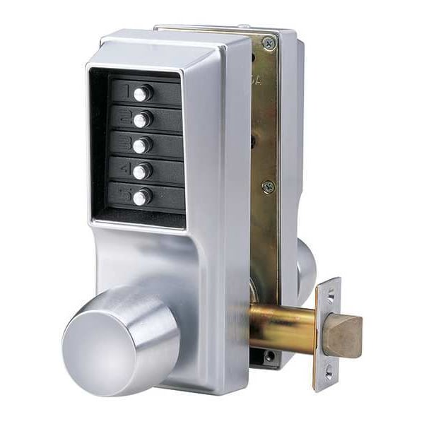 Mechanical Push Button Lockset, Handle Type Knob, Function Entry, Key Override Options None, Hand Nonhanded, Finish Satin Chrome, Door Thickness 1-3/4 in, Keypad 5 Button, Vandal Resistant, Backset 2 3/4 in, Grade 1, ADA Compliant No, Yes Fire Rated, Case Material Steel, Series 1000, Latch Length 1/2 in, Max. User Codes 1, Standards UL/cUL Listed, Weather Resistant Yes, Mechanical