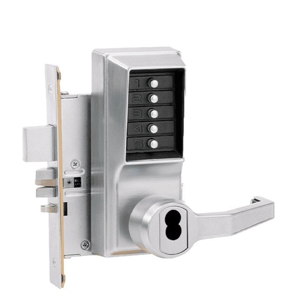 Kaba: Simplex Mortise Combination Lever Lock, Key Override, Passage, Lockout, 6/7-Pin SFIC Prep, Less Core, RH, Satin Chrome