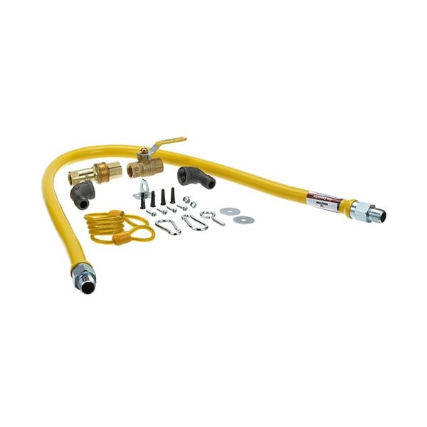 Gas hose 48 in (L) 1/2 in Connection Stainless; steel corrugated tube and braiding PVC; coating Includes, quick disconnect, gas ball valve, 90 DEG.; elbows and restraining cable with hardware Rotational end; fitting Yellow color Temperature resistant up to; 350 DEG.F CSA certified