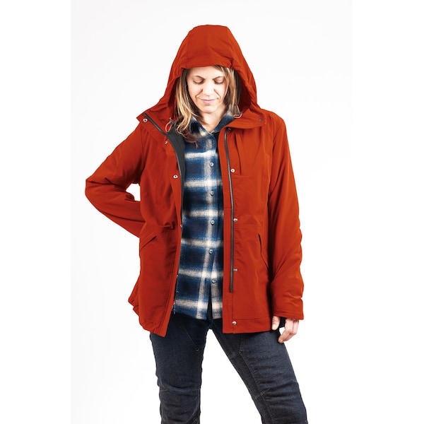 Check off those chores in the ultimate do-it-all coat. There's a reason that our ultimate outer layer is named for a sculptor. We have carved out a space to shape technical workwear for women by molding a new classic coat that expresses movement in three dimensions. Fashioned from strong, abrasion-resistant fabric with a warm, light, fleece core and poly-fill insulation, this piece is water and windproof, stretchable and breathable. Cut long in the back with underarm vents, swing gussets at the shoulder blade and five intuitive pockets, it's chiseled in all the right places. Multiple drawcords serve to contour the hood for ideal peripheral vision and seal around the hips to keep out the weather. Double-layer cuffs featuring runner’s thumbholes offer extra warmth and coverage as you work. Offered in paprika and black.