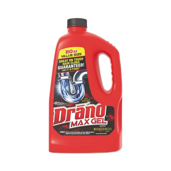 Drano Max Gel Clog Remover is an 80 oz. thick bleach formula designed to target and dissolve tough clogs in drains. It effectively removes hair, soap scum, and other debris by clinging to clog material and cutting through standing water. The gel consistency allows it to penetrate and break down blockages quickly. Suitable for use in household drains, it helps maintain clear pipes by addressing stubborn buildup. This pack of 6 bottles is manufactured by SC Johnson.