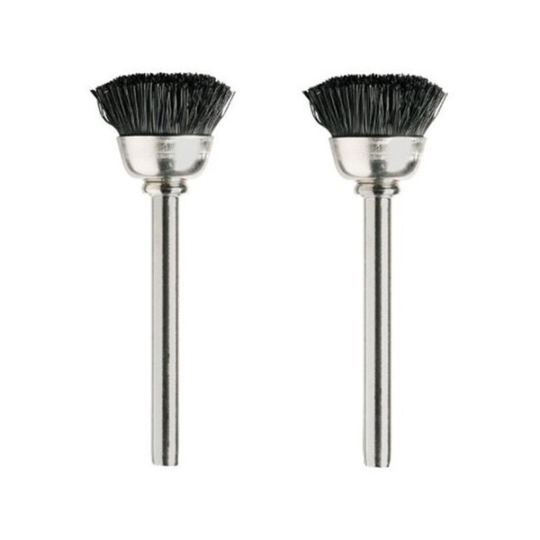 Nylon is used in wet and dry environments. It has a low moisture absorption rate and conforms well to surfaces. 'Crimped brushes provide additional strength compared to straight brushes and are commonly used where a knotted brush's impact would alter the working surface. Features Cup Brushes Brush Diameter Specifications Material: Nylon Dimension: 4 H x 2 W x 1 L Weight: 0.1 lbs