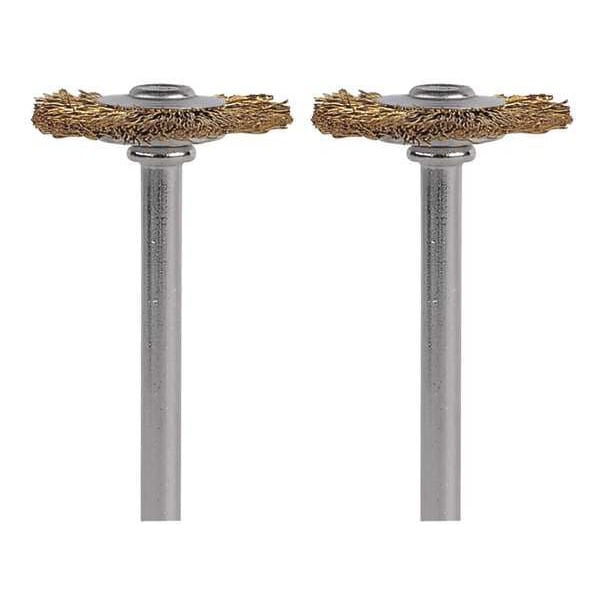 Rotary Tool Brush, Bristle Material Brass, Brush Diameter 3/4 in, Shank Diameter 1/8 in, Brush Type Wheel Brush, Bristle Type Crimped, Material Application Brass, Bronze, Copper, Gold, Max. Speed 15,000 RPM, Mount Type Mounted, Package Quantity 2