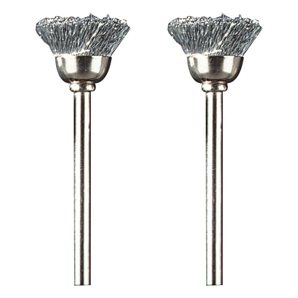 Rotary Tool Brush, Bristle Material Carbon Steel, Brush Diameter 1/2 in, Shank Diameter 1/8 in, Brush Type Cup Brush, Bristle Type Straight, Material Application Brass, Copper, Gold, Soft Ferrous Metals, Wood, Max. Speed 15,000 RPM, Mount Type Mounted, Package Quantity 2