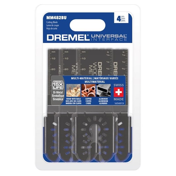 The Dremel MM482B-4 Wood and Metal Flush Cut Blade is ideal for cutting doorjambs and baseboards for flooring installation. Used for precise cuts and plunge cuts, its wide 1-1/4 In. blade speeds through long cuts and can make plunge cuts up to 1-5/8 In. deep. Designed for cutting wood, drywall, plastic, and soft metal like copper and 6d-8d finishing nails. The blade's tooth pattern similar to a standard hacksaw blade.