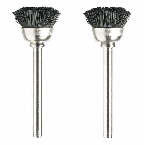 Rotary Tool Brush, Bristle Material Nylon, Brush Diameter 1/2 in, Shank Diameter 1/8 in, Brush Type Cup Brush, Bristle Type Straight, Material Application Aluminum, Hard Plastic, Silverware, Max. Speed 15,000 RPM, Mount Type Mounted, Package Quantity 2