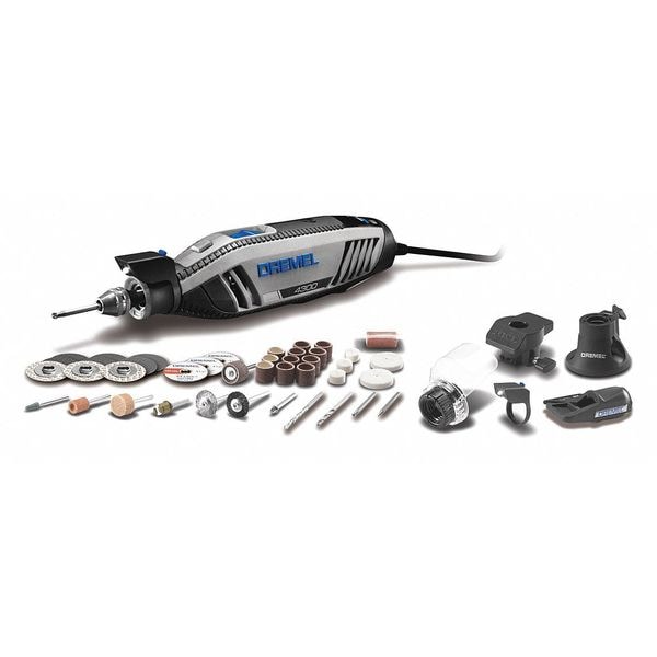 Rotary Tool Kit, Tool Style Handheld, Collet Size 1/32 to 1/8 in, Current 1.8 A, Speed Setting Variable Speed, Max. Speed 35,000 RPM, Minimum Speed 5,000 RPM, Number of Speed Settings Variable, Kit Contents (1) Bare Tool, (40) Assorted Accessories, Accessory Free Tool Change Yes, Wheel Diameter 6 in, Switch Type Slide, Handle Type In-Line, Overall Length 9 in, Tool Weight 1.18 lb, Application Carving, Cleaning, Cutting, Engraving, Grinding, Polishing, Sanding, Sharpening, Voltage 120V AC