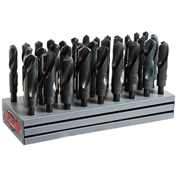 33 Piece HSS Black Oxide Reduced Shank HSS Drill Bit Set, 1/2" - 1", Metal Stand