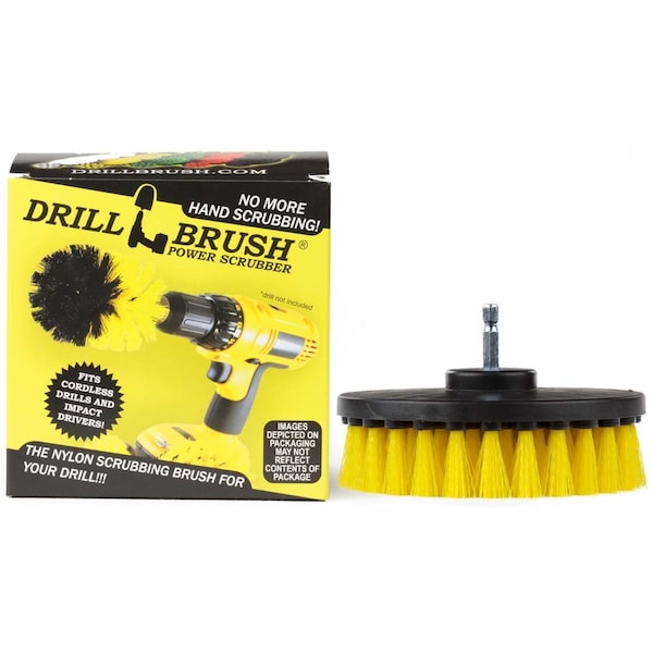 The high speed rotation of the drill combined with high quality premium medium duty bristle brush lifts and easily extracts spots from leather and fabric upholstery or carpet. These ultra-premium, medium duty brushes are available in two varieties to suit your cleaning needs. The Drill Brush yellow medium carpet brush is meant for rigorous scrubbing of carpets, tub and tile, and flooring. The bristles are stiff enough to dislodge old stains and they will hold up better than the soft carpet brush on heavy duty carpet. You can also use this brush on tiles, grout, and floor pads.Cordless drill NOT included Drill NOT included