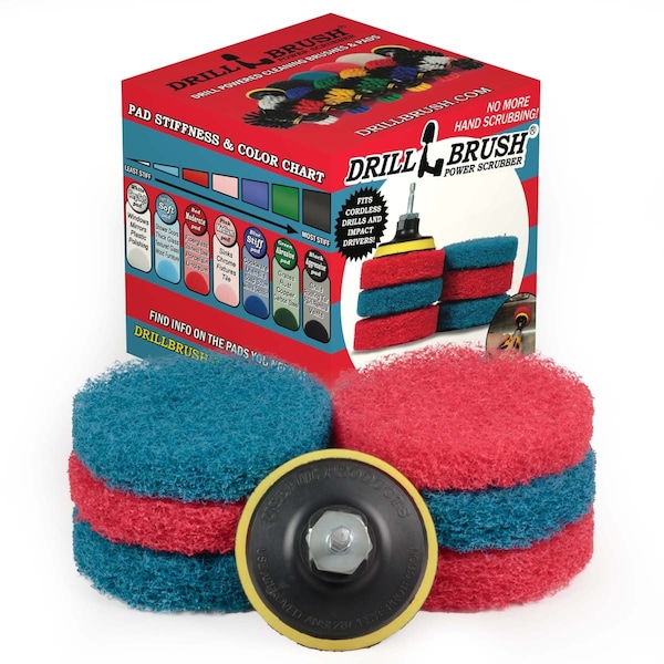 Restore your bathroom surfaces and say goodbye to: Soap Scum, Hard Water Stains, Calcium, Mineral and Rust Deposits. Our Drill Brush inspired scouring and stiff scrubbing pads attach to a hook and loop backer, with a quarter inch quick change steel shaft that fits most all cordless drills and drivers. Utilize the power of your drill to save you from tedious hand scrubbing. These power driven scrub pads will shorten the time you used before to spend hand scrubbing. The pads are reusable and will cut through mold, mildew, hard water stains, calcium, and rust. Our pads work well on tile and grout, sinks, bathtubs, showers, and baseboards. Great for cleaning lawn furniture and other outdoor surfaces.