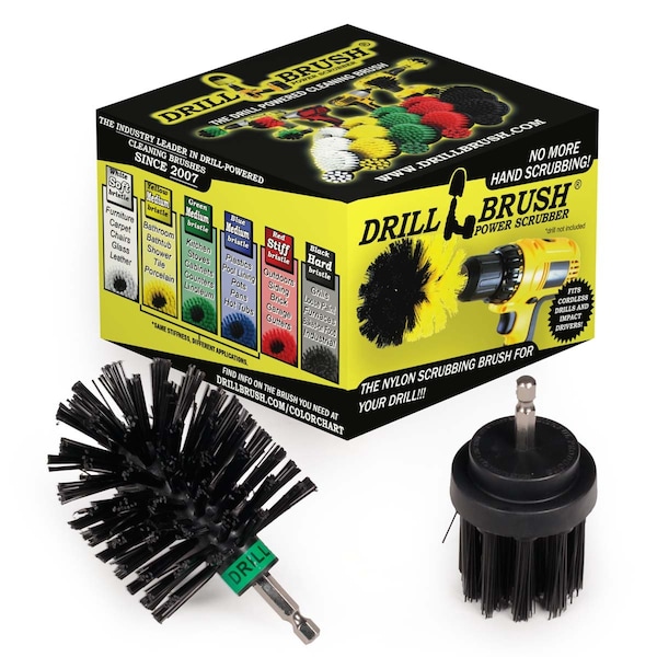 Nylon Bristled Scrub Brush that fits any Cordless Drill. Great for heavy duty cleaning. These Drillbrush power scrubbers are our stiffest brushes for use on the most difficult to clean surfaces. This kit includes a mini size black ultra stiff original Drillbrush. This brush is great for getting into tight corners and crevices that larger brushes may clean less effectively. The smaller diameter of the round 2 inch diameter scrub brush allows access for greater control of the brush while using it to strip loose paint, clean bricks, or other harsh scrubbing applications. The increased bristle length of this brush allows the user to clean more narrow crevices or openings then the normal bristle length brushes. Cordless Drill Not Included.