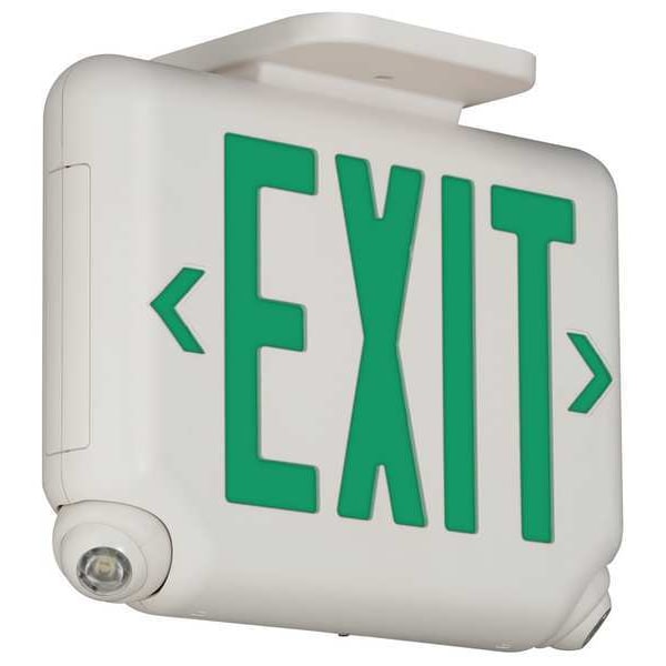 Exit Sign with Emergency Lights, Letter Color Green, Number of Faces 2, Directional Indicators - Emergency Lighting and Exit Signs Universal Field Selectable Chevrons, Light Source- Emergency Lighting and Exit Signs LED, Housing Material - Emergency Lighting and Exit Signs Plastic, Housing Color - Emergency Lighting and Exit Signs White, Battery Chemistry Lithium Iron Phosphate, Voltage - Emergency Lighting and Exit Signs 6.4, Number of Lamp Heads 2