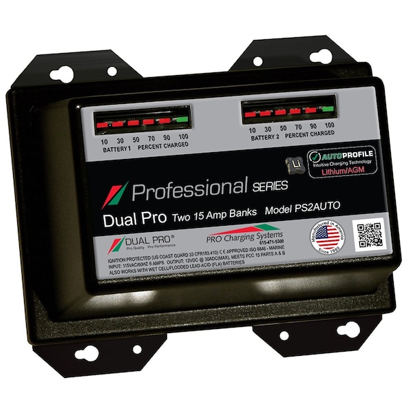 PS2 Auto 15A - 2-Bank Lithium/AGM Battery Charger Latest Technology: Detects if your battery is Lithium or AGM Automatically charges both Lithium and AGM batteries for optimal performance Fully automatic. Completely and safely charges both Lithium and AGM batteries Algorithms designed and validated with battery manufacturers for a 100% charge Startup feature will wake up batteries that have turned off due to low voltage protection Auto return to charge feature Quickest charge times in its class Unbeatable performance, reliability, safety, and quality delivered by DUAL PRO Features: Waterproof - Use on land and in fresh and saltwater TROUBLE-FREE—Just Plug It In and Forget It! Independent outputs Fully automatic/multi-stage charging On-board diagnostic codes FCC 15 Parts A, B interference compliant Approved and meets ISO 8846 Marine standards Ignition protected US Coast Guard 33 CFR 183.410 3-Year Warranty AutoProfile Intuitive Charging Technology Lithium/AGM Professional and Sportsman Series chargers have set the standard in the marine industry for more than two decades, known as the safest, most reliable, and best performing chargers in the industry. AutoProfile Intuitive Charging Technology provides flexibility for your charging system, ready for the ever-changing lithium battery technologies. No matter if you choose Lithium or AGM batteries for your boat, Dual Pro is ready to keep your boat on the water longer, enhancing battery performance and extending battery life. This product may not be returned to the original point of purchase. Please contact the manufacturer directly with any issues or concerns.
