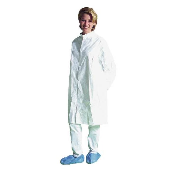 Disposable Lab Coat, Anti-Static No, Attached Hood No, Chest Size - Maximum 50 1/4 in, Chest Size - Minimum 46 3/4 in, Clean Process Status Clean Processed, Closure Type Snaps, Collar Style Plain, Color White, Cuff Style Elastic, Features Adjustable Snap at Neck, Federal 209E Cleanroom Class 100, Gender Unisex, Hazard Type Non-Hazardous Dry Particulates, Non-Hazardous Liquids, Height - Maximum 76 in, Height - Minimum 74 in, ISO Cleanroom Class ISO 5 (Class 100) and above, Launderable No