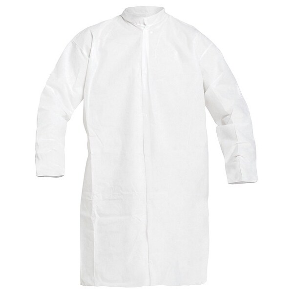 Disposable Lab Coat, Anti-Static No, Attached Hood No, Chest Size - Maximum 40 1/4 in, Chest Size - Minimum 36 3/4 in, Clean Process Status Not Clean Processed, Closure Type Snaps, Collar Style Mandarin, Color White, Cuff Style Elastic, Features Extends to Knee, Set Sleeve, Federal 209E Cleanroom Class Not Rated, Gender Unisex, Hazard Type Non-Hazardous Dry Particulates, Non-Hazardous Liquids, Height - Maximum 67 in, Height - Minimum 5 ft, ISO Cleanroom Class Not Rated, Launderable No