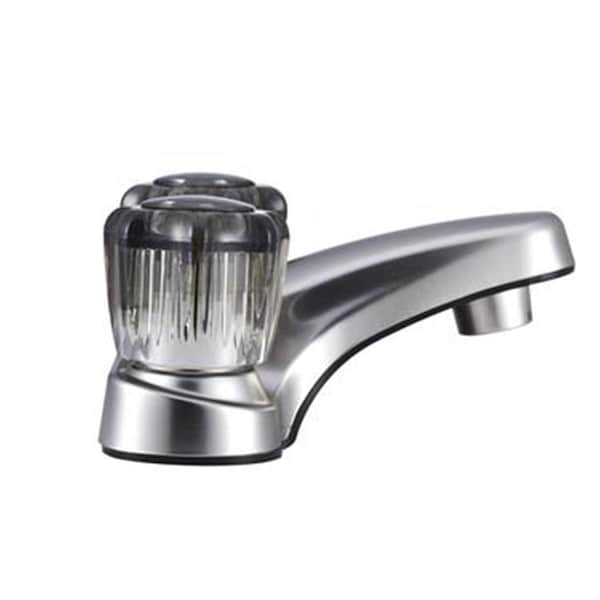 Features Premium Grade Light Weight Synthetic Waterways Lead Free Certified Smoked Acrylic Knobs Specifications Recommended Use - Lavatory Type - Single Piece 4 in. Deck Mount Size - 4 in. Handle Type - Knob Number of Handles - 2 Finish - Brushed Satin Nickel Plated Material - Plastic Valve Type - Washerless Cartridge