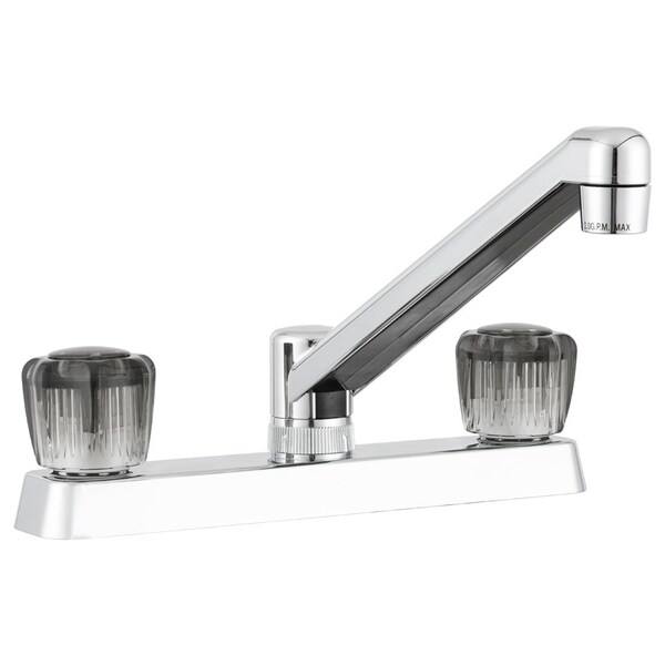 Used For Kitchen; Single Piece 8 Inch Deck Mount; 2 Smoked Acrylic Knob Handle; Chrome Plated/ Plastic; 2 Hole Application; Washerless Cartridge Valve