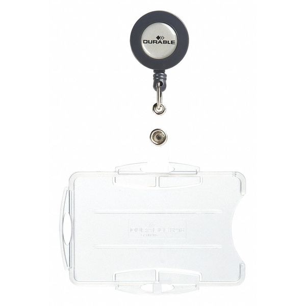Badge Holder, Dual, Number Series Blank, Material Polystyrene, Color Translucent, Length 2 3/4 in, Width 3 9/16 in, Height 5 3/4 in, Retracted Length 2 3/4 in, Extended Length 23 in, Legend No Legend, For Use With Badges, ID Cards, Includes Badge Reel, Material Thickness 1/4 in, Package Quantity 10