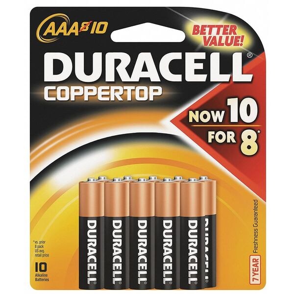 Battery, AAA, Battery Chemistry Alkaline, Voltage - Batteries 1.5V DC, Max. Operating Temp. 130 Degrees F, Min. Operating Temp. -4 Degrees F, Standards ANSI, Diameter 0.39 in, Height 1.70 in, Overall Height 1.73 in, Package Quantity 10