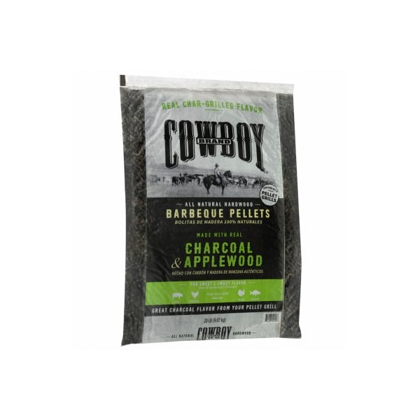 Cowboy 20 lb CharcoalApple Pellets Made with 100 natural apple wood and all natural hardwood charcoal, with no additives The addition of natural charcoal to the pellet adds an authentic chargrilled flavor to your foods For a bold and hearty flavor, use charcoal hickory barbeque pellets to cook pork, chicken, turkey and seafood