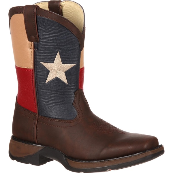 Kids Texas Flag Boot A lot of great things can be associated with the state of Texas; good food, warm weather, beautiful scenery, cowboys, great universities and of course football. By wearing these Lil' Durango kids' Western boots your child can show their love for the state and look adorable all at the same time. The upper of this Western boot has been made from synthetic leather and it has a Texas flag on its shaft. Although this material looks like real leather, it is easy to clean and is durable. Having a decorative toe bug stitch on the foot, double rows of welt stitching and a square toe adds authenticity to this footwear and makes it look like a grownup's Western boot. To make this kids' boot easy to get on/off, it has been built with a dipped topline and pull tabs. On the inside of this footwear, there is a mesh lining; it is lightweight, feels soft and will keep these boots from rubbing against your child's legs. There is also a cushion flex insole; it is an outstanding feature to have because it will keep their little feet comfortable. The tempered steel shank is another great feature that has been built into this Western boot; it provides arch support and will allow your child to walk steadily. On the bottom of this boot, there is a Lil' Durango outsole and a low 1 1/8in rocker heel. These Lil' Durango kids' Western boots are a no brainer; they're adorable, have tons of authentic looking details and are comfortable for your little one to wear. Now, deciding whether to support the Longhorns or the Aggies, that's a difficult decision. . .