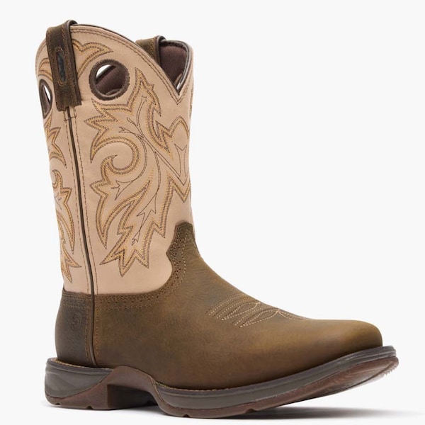 Pull on lightweight comfort in the men's Coffee/Bone Durango Rebel collection. This style features full-grain leather, a soft mesh lining, the Durango X-Pand System for easy on/off, the Durango Advanced Comfort System Footbed with InsulKul for temperature regulation and a cushion flex insole. The shank is tempered steel and includes a rolled shank area. This style is finished off with an EVA midsole, slip, oil and abrasion-resistant rubber outsole, double row sole stitch, 1-1/2" Rocker heel and square toe.