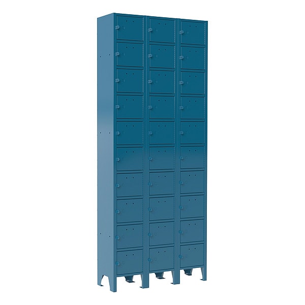 Cell Phone Locker, Frame Assembled Assembled, Leg Height 3 1/2 in, Number of Tiers 10, Number of Units Wide 3, Wall-Mounting Type Not Applicable, Handle Type Pull, Locker Color Blue, Mounting Location Freestanding, Mounting Style Surface, Number of Lockers 30, Opening Depth 8 7/8 in, Opening Height 5 3/4 in, Opening Width 6 3/8 in, Overall Depth 9 in, Overall Height 66 5/8 in, Overall Width 27 in, Includes Plastic cable grommets, Includes Number Plates No, Locker Finish Powder Coated