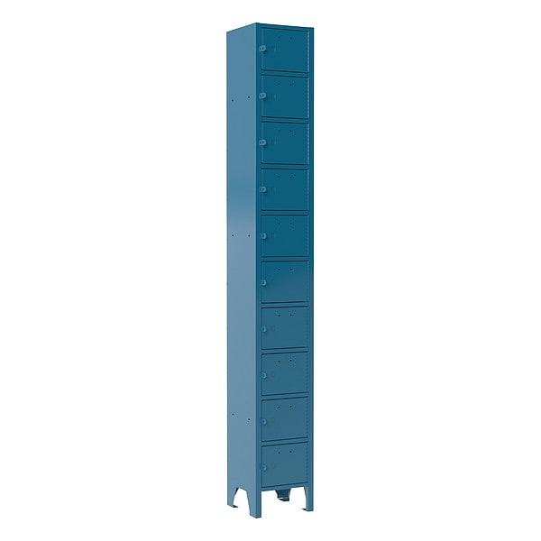 Cell Phone Locker, Frame Assembled Assembled, Leg Height 3 1/2 in, Number of Tiers 10, Number of Units Wide 1, Wall-Mounting Type Not Applicable, Handle Type Pull, Locker Color Blue, Mounting Location Freestanding, Mounting Style Surface, Number of Lockers 10, Opening Depth 8 7/8 in, Opening Height 5 3/4 in, Opening Width 6 3/8 in, Overall Depth 9 in, Overall Height 66 5/8 in, Overall Width 9 in, Includes Plastic cable grommets, Includes Number Plates No, Locker Finish Powder Coated