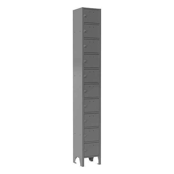 Cell Phone Locker, Frame Assembled Assembled, Leg Height 3 1/2 in, Number of Tiers 10, Number of Units Wide 1, Wall-Mounting Type Not Applicable, Handle Type Pull, Locker Color Gray, Mounting Location Freestanding, Mounting Style Surface, Number of Lockers 10, Opening Depth 8 7/8 in, Opening Height 5 3/4 in, Opening Width 6 3/8 in, Overall Depth 9 in, Overall Height 66 5/8 in, Overall Width 9 in, Includes Plastic cable grommets, Includes Number Plates No, Locker Finish Powder Coated