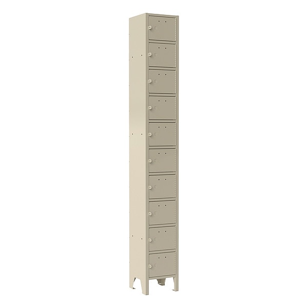 Cell Phone Locker, Frame Assembled Assembled, Leg Height 3 1/2 in, Number of Tiers 10, Number of Units Wide 1, Wall-Mounting Type Not Applicable, Handle Type Pull, Locker Color Tan, Mounting Location Freestanding, Mounting Style Surface, Number of Lockers 10, Opening Depth 8 7/8 in, Opening Height 5 3/4 in, Opening Width 6 3/8 in, Overall Depth 9 in, Overall Height 66 5/8 in, Overall Width 9 in, Includes Plastic cable grommets, Includes Number Plates No, Locker Finish Powder Coated