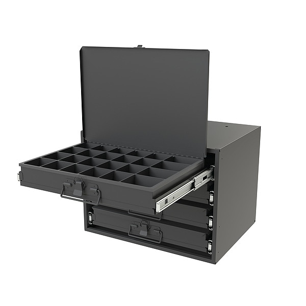 Sliding Drawer Cabinet, Box Width 18 in, Compartment HxWxD (20) 2 in x 2 3/16 in x 1 15/16 in (4) 2 in x 2 3/16 in x 2 3/4 in, Frame Assembled Assembled, Slide Type Bearing, Box Height 3 in, Cabinet Color Gray, Number of Boxes 4, Number of Compartments 4, Overall Depth 11 7/8 in, Overall Height 11 7/8 in, Overall Width 15 5/8 in, Stackable Yes, Adjustable Dividers No, Box Depth 12 in, Box Handle Material Steel, Box Handle Type Pull, Cabinet Finish Powder Coated, Cabinet Material Steel