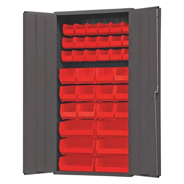 Bin Cabinet, Base Type Frame, Bin Color Red, Bin HxWxD (12) 8 in x 15 in x 7 in, (18) 6 in x 11 in x 5 in, (6) 16 in x 15 in x 7 in, Cabinet Color Gray, Cabinet Storage Components Bins, Door Type Solid, Frame Assembled Assembled, Mobility Stationary, Number of Bins 36, Number of Cabinet Bins 36, Number of Door Bins 0, Number of Shelves 0, Overall Depth 18 in, Overall Height 72 in, Overall Width 36 in, Bin Depth 11 in, 15 in, Bin Height 5 in, 7 in