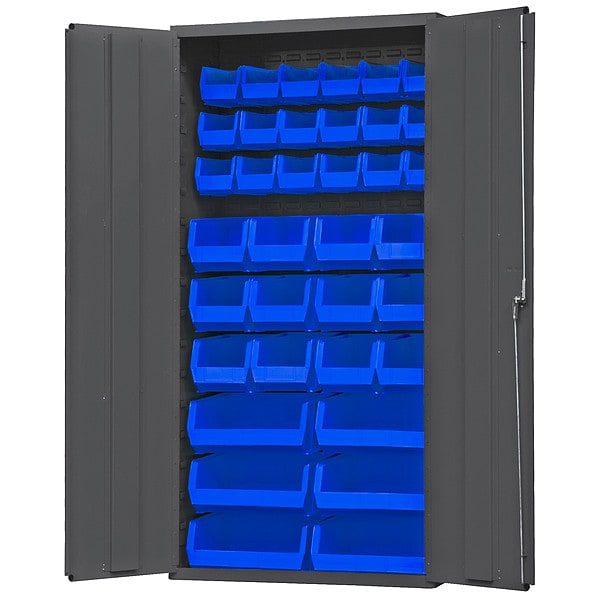Bin Cabinet, Base Type Frame, Bin Color Blue, Bin HxWxD (12) 8 in x 15 in x 7 in, (18) 6 in x 11 in x 5 in, (6) 16 in x 15 in x 7 in, Cabinet Color Gray, Cabinet Storage Components Bins, Door Type Solid, Frame Assembled Assembled, Mobility Stationary, Number of Bins 36, Number of Cabinet Bins 36, Number of Door Bins 0, Number of Shelves 0, Overall Depth 18 in, Overall Height 72 in, Overall Width 36 in, Bin Depth 11 in, 15 in, Bin Height 5 in, 7 in