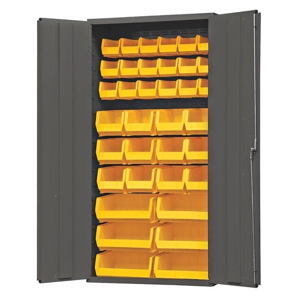 Bin Cabinet, Base Type Frame, Bin Color Yellow, Bin HxWxD (12) 8 in x 15 in x 7 in, (18) 6 in x 11 in x 5 in, (6) 16 in x 15 in x 7 in, Cabinet Color Gray, Cabinet Storage Components Bins, Door Type Solid, Frame Assembled Assembled, Mobility Stationary, Number of Bins 36, Number of Cabinet Bins 36, Number of Door Bins 0, Number of Shelves 0, Overall Depth 18 in, Overall Height 72 in, Overall Width 36 in, Bin Depth 11 in, 15 in, Bin Height 5 in, 7 in