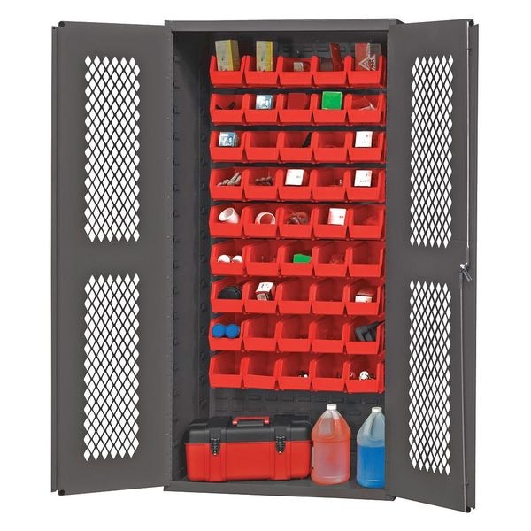 Bin Cabinet, Base Type Frame, Bin Color Red, Bin HxWxD (45) 6 in x 11 in x 5 in, Cabinet Color Gray, Cabinet Storage Components Bins, Door Type Ventilated, Frame Assembled Assembled, Mobility Stationary, Number of Bins 45, Number of Cabinet Bins 45, Number of Door Bins 0, Number of Shelves 0, Overall Depth 18 in, Overall Height 72 in, Overall Width 36 in, Bin Depth 11 in, Bin Height 5 in, Bin Material Polypropylene, Bin Width 6 in, Cabinet Finish Powder Coated