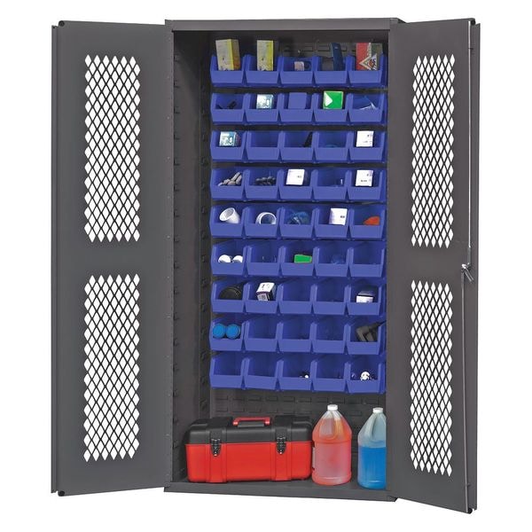 Bin Cabinet, Base Type Frame, Bin Color Blue, Bin HxWxD (45) 6 in x 11 in x 5 in, Cabinet Color Gray, Cabinet Storage Components Bins, Door Type Ventilated, Frame Assembled Assembled, Mobility Stationary, Number of Bins 45, Number of Cabinet Bins 45, Number of Door Bins 0, Number of Shelves 0, Overall Depth 18 in, Overall Height 72 in, Overall Width 36 in, Bin Depth 11 in, Bin Height 5 in, Bin Material Polypropylene, Bin Width 6 in, Cabinet Finish Powder Coated