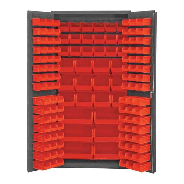 Bin Cabinet, Base Type Frame, Bin Color Red, Bin HxWxD (12) 8 in x 15 in x 7 in, (18) 6 in x 11 in x 5 in, (48) 4 in x 5 in x 3 in, (48) 4 in x 7 in x 3 in, (6) 16 in x 15 in x 7 in, Cabinet Color Gray, Cabinet Storage Components Bins, Door Type Flush, Frame Assembled Assembled, Mobility Stationary, Number of Bins 132, Number of Cabinet Bins 36, Number of Door Bins 96, Number of Shelves 0, Overall Depth 24 in, Overall Height 72 in, Overall Width 36 in, Bin Depth 5 in, 7 in, 11 in, 15 in
