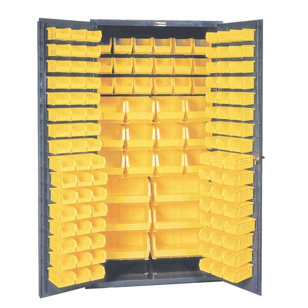 Bin Cabinet, Base Type Frame, Bin Color Yellow, Bin HxWxD (12) 8 in x 15 in x 7 in, (18) 6 in x 11 in x 5 in, (48) 4 in x 5 in x 3 in, (48) 4 in x 7 in x 3 in, (6) 16 in x 15 in x 7 in, Cabinet Color Gray, Cabinet Storage Components Bins, Door Type Flush, Frame Assembled Assembled, Mobility Stationary, Number of Bins 132, Number of Cabinet Bins 36, Number of Door Bins 96, Number of Shelves 0, Overall Depth 24 in, Overall Height 72 in, Overall Width 36 in, Bin Depth 5 in, 7 in, 11 in, 15 in